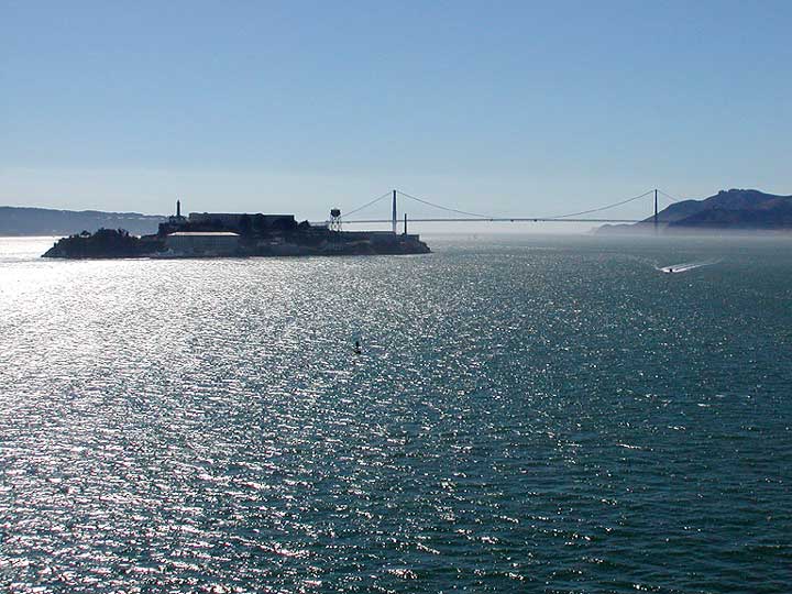 Approaching Alcatraz Island with the Golden Gate Bridge in the background