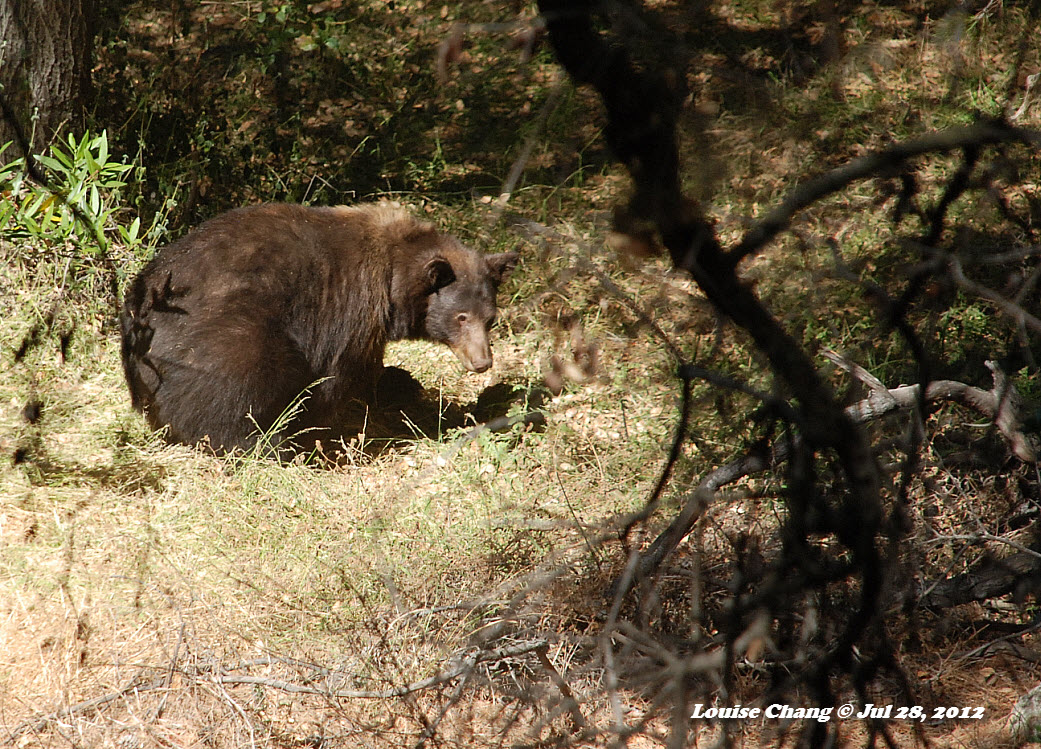 A mother California Black Bear with twin cubs foraging behind The Cabin. Even though she appears reddish brown, this is a Black Bear, the only bear species found in California.