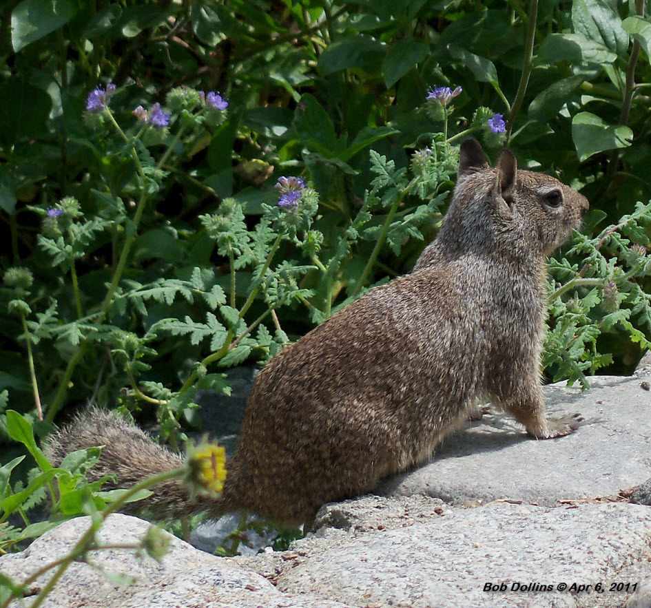 A California Ground Squirrel seen at Eaton Canyon Natural Area with Common Phacelia (Phacelia distans) behind it. These squirrels are also found in the lower areas of Monrovia Canyon Park. Click on the photo for more info.