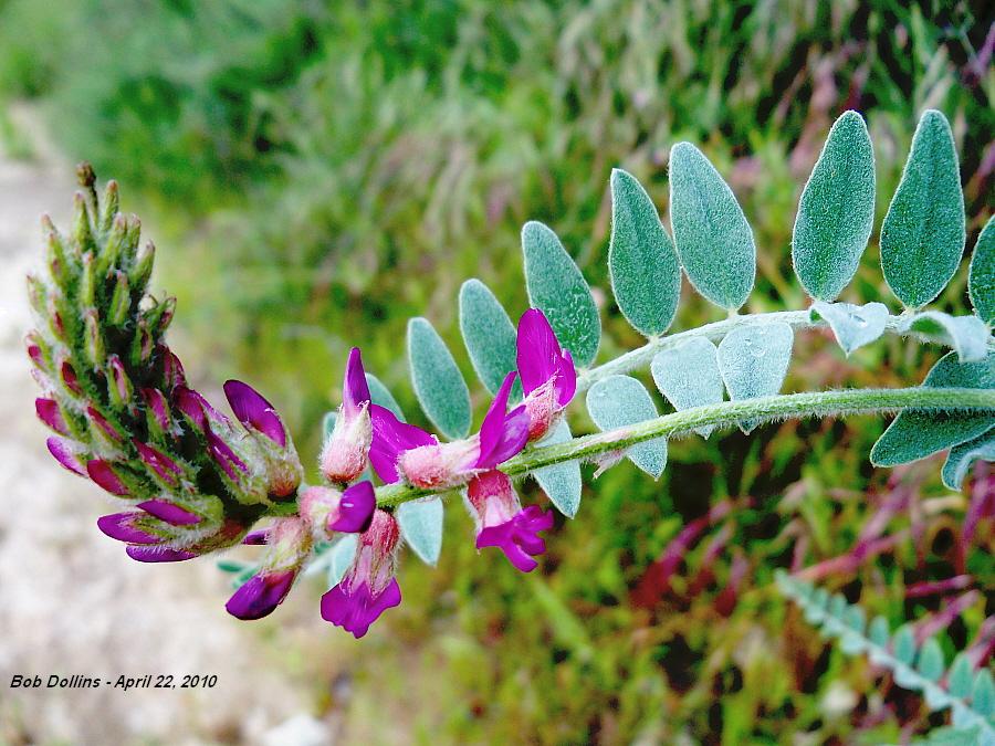 Closeup of the bloosom stalk and fuzzy compound leaflets of the Braunton's Milkvetch.