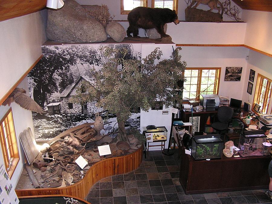 : Overhead view of the other side of the lobby with more displays of the plants and animals that can be found at the park.