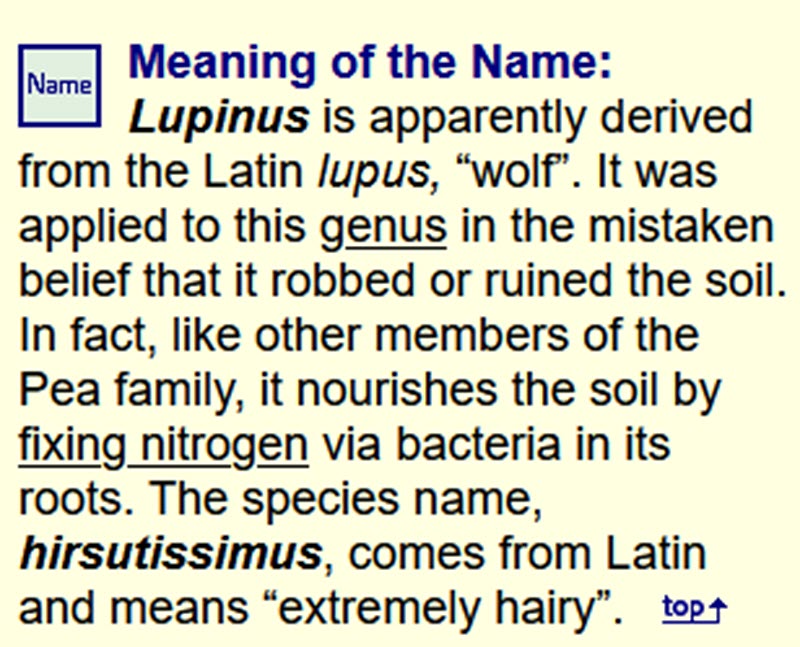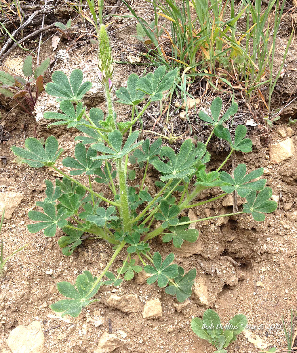 This member of the Pea or Legume family (Fabaceae), that was seen on the Bill Cull Trail, has the familiar looking palmate leaf pattern common to all Lupines but is identified by its broad leafs and the bristly hairiness on all parts of the plant.