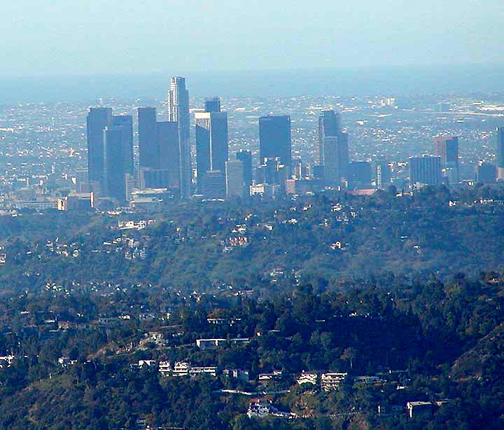 : Spectacular view from Echo Mountain of the LA skyline more than 20 miles away. Santa Monica Bay and the horizon of the Pacific Ocean can be seen in the background.