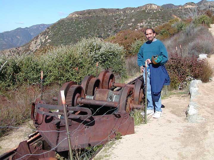 : Bhushan Gadgil next to remains of old Mt Lowe electric trolley that can be seen at the Echo Mountain Resort ruins.
