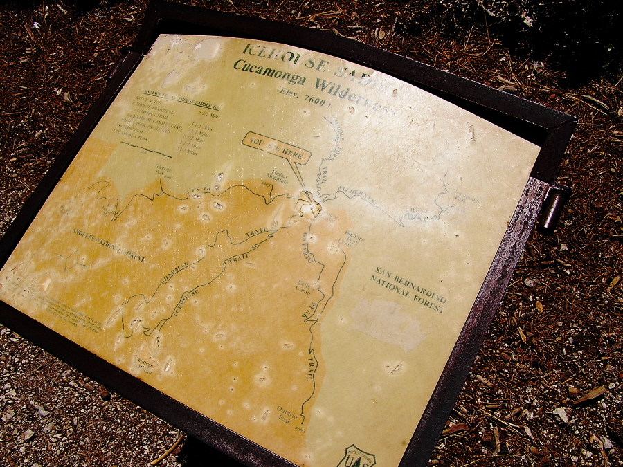 | Icehouse Canyon Trail: Closeup of the USFS trail info sign at the Saddle taken on a June 13, 2008 hike. Photo by Bob Dollins |