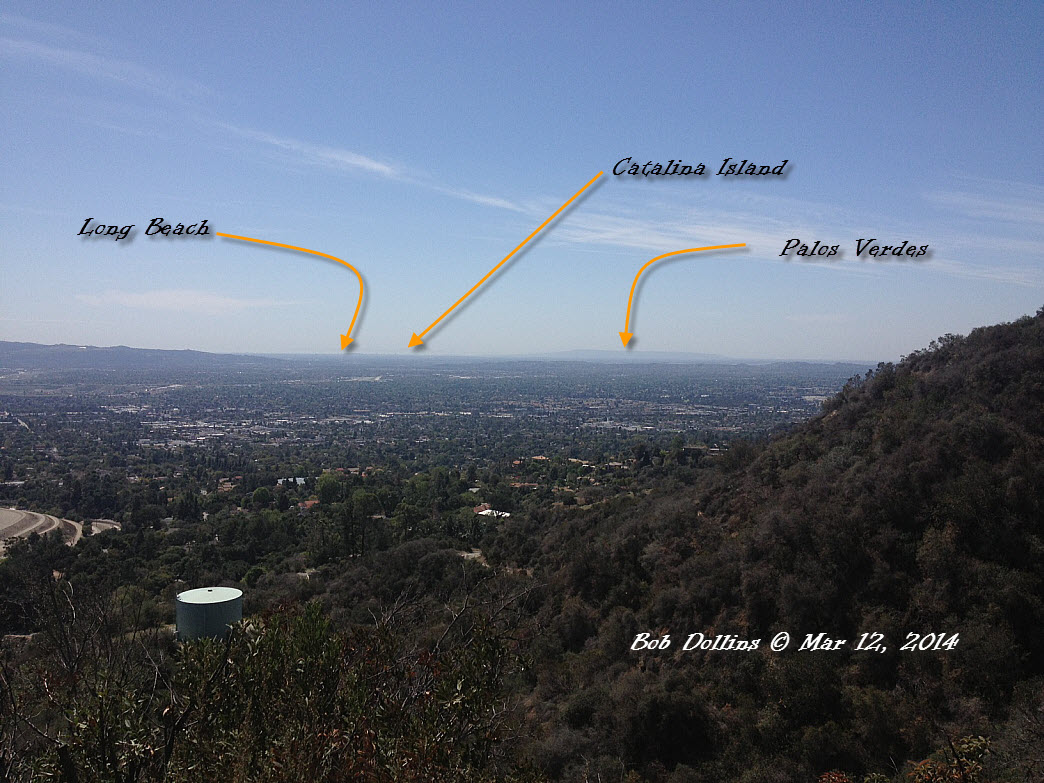 View from the 1,477 foot Overlook Trail summit, looking south, of Long Beach and Catalina Island, some 30 and 60 miles away respectively.