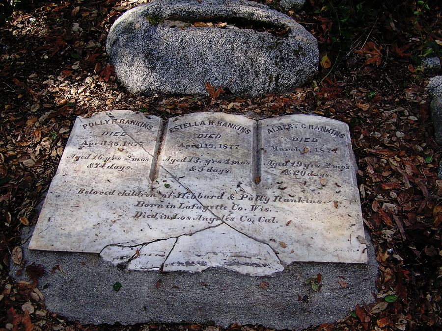 About one mile from Monrovia is Sawpit Canyon, a pleasure resort for hundreds of picnickers who make daily and weekly pilgrimages to Sawpit Falls. A few hundred yards from the forks is a large open space, which has the appearance of a well kept lawn. Here are seen two large oaks, a flowering oleander and an orange tree of some year's growth. Under one of these trees is a pile of rocks which appears to have been the foundation of a house. The clue to these traces of early habitation is found in a trail that leads up to a bit of a mesa. On this little eminence are three graves Little is known beyond the fact that the stones record the names of three children who died in 1877. Monrovia did not then exist as a town, but one of the old settlers of Duarte tells this story... Hibbard Rankin, a sturdy former of LaFayette County, in Wisconsin, with his wife Polly and five little children, came to the new world of California and settled in Sawpit Canyon. In a clearing made by an earlier and more adventurous settler he made his home. Under each of the oaks stood a cabin rudely constructed of forest lumber. Fruit trees were set out, a garden was planted, bees helped to furnish a living and the canyon bounty yielded the wood which was hauled with great difficulty to Los Angeles. The father and mother were spirtualist of a type not uncommon at that time, and the oldest daughter was a would-be medium. There were many gatherings of the elect in the interests of the cult in this favorable place. Some of the children attended school in Duarte, walking the entire distance each day. Albert, the nineteen-year-old son, who was a blacksmith's apprentice in San Gabriel, came home for a Sunday visit and suddenly became very ill. The malady proved to be typhoid fever. There were few facilities for nursing, the only doctor being a young man who was far gone with consumption. Imagine the sorrow of the family when, in a few weeks time, nineteen-year-old Albert, thirteen-year-old Polly and sixteen-year-old Stella were laid to rest in this improvised graveyard. The place soon became too lonely for the bereaved parents and they returned to their home in Wisconsin. A canyon fire swept the cabin from the place and the flood of 1882 displaced the foundation. The only reminder of that mountain home and its sorrow is the small graveyard. from "The Crimson and White" by Stella Nelson, Monrovia High School - Class of 1913 |