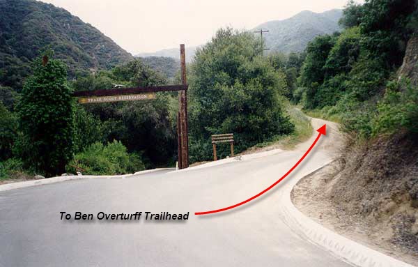 This is the entrance to the Trask Scout Reservation Campground operated by the San Gabriel Valley Council of the Boy Scouts of America. Take the road to the right where the blacktop ends and continue up the dirt road a few hundred yards and you will come to the Ben Overturff Trailhead.